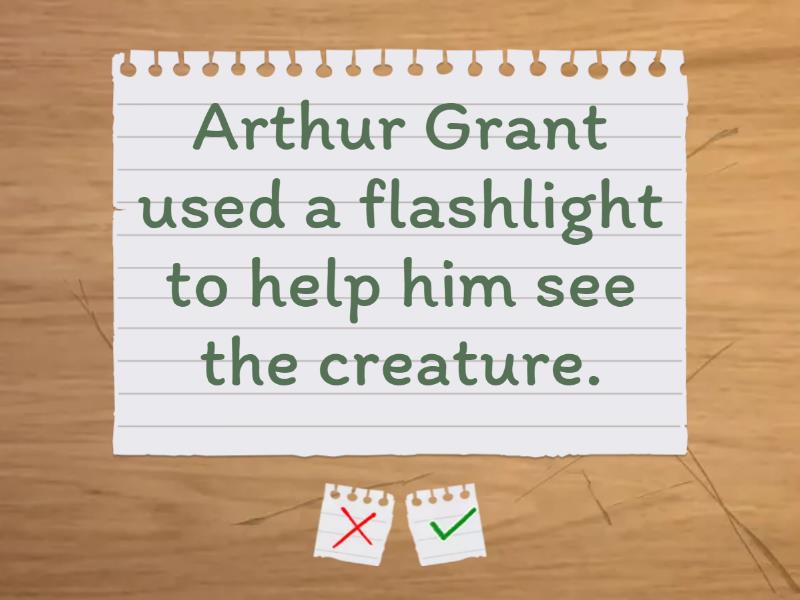 Arthur Grant's encounter with Nessie occurred on January 5, 1934. - True, Arthur Grant was driving a car when he saw the creature. - False: Arthur Grant was on his motorbike, not driving a car., The sighting took place in the early morning hours. - True, The night sky was completely dark, with no moon visible. - False: The night sky was "lighted by an eerie, full moon.", Arthur Grant used a flashlight to help him see the creature. - False: He used the bike's headlights, not a flashlight., The creature was about 10 meters away when Grant first saw it. - False: It was "From a distance of about 35 meters," not 10 meters., The creature had a very large head and a short neck. - False: The creature seemed to have a "rather small head on top its very long neck," not a large head and short neck., Grant's motorbike remained upright after he gripped the brakes. - False: The motorbike "swerve and crash onto the road.", The creature slowly walked into Loch Ness. - False: The creature "plunged into Loch Ness in one big splash," not slowly walked., Arthur Grant believed the creature was a known species of animal. - False: He concluded it "couldn't have been a deer or any other animal he knew.", Arthur Grant immediately called the police after his encounter. - Not Mentioned, Arthur Grant's mother suggested he might have seen a large fish. - False: His mother said he may have seen a "giant lizard or something," not a large fish., Arthur Grant began drawing sketches of Nessie weeks later. - False: He made sketches "During the next few days," not weeks later., The creature made a loud roaring sound before entering the lake. - Not Mentioned, Arthur Grant always wanted to remember the creature he saw. - True,