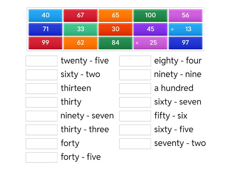 13 - thirteen, 33 - thirty - three, 25 - twenty - five, 62 - sixty - two, 45 - forty - five, 99 - ninety - nine, 67 - sixty - seven, 84 - eighty - four, 30 - thirty, 71 - seventy - two, 40 - forty, 97 - ninety - seven, 100 - a hundred, 56 - fifty - six, 65 - sixty - five,
