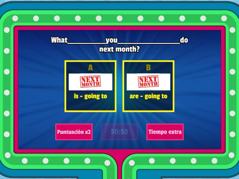 1) What___________you__________________do next month? a) is - going to b) are - going to 2) How__________he________________help us? a) is - going to b) he is - going to 3) My brother______________________________a pizza night tomorrow. a) are going to have b) is going to have 4) ______________________________is going to help me to prepare some sandwiches next Tuesday. a) My friends b) My mom c) I 5) _________ they_______________________collect money? a) Is - going to b) Is - going to c) Are - going to 6) I______________ make big posters for Car wash next summer. a) am going to b) are going to