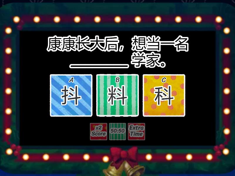 1) 康康长大后,想当一名 ________ 学家。 a) 抖 b) 料 c) 科 2) 你一定要 ________ 力学习,才能取得好成绩。 a) 努 b) 怒 c) 奴 3) 妈妈小时候的 ________ 望是成为一名教师。 a) 愿 b) 原 c) 源 4) 每天放学回家,我会花一个小时 ________ 习课文。 a) 夏 b) 复 c) 腹 5) 为了 ________ 现当运动员的愿望,哥哥每天都得努力练习。 a) 买 b) 实 c) 头