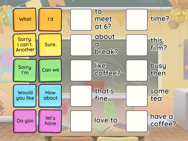 let’s have - some tea, Can we - have a coffee?, Would you like - to meet at 6?, How about - this film?, What - about a break?, Sorry. I’m - busy then, Sure, - that’s fine, I’d - love to. , Sorry. I can’t. Another - time?, Do you - like coffee?,