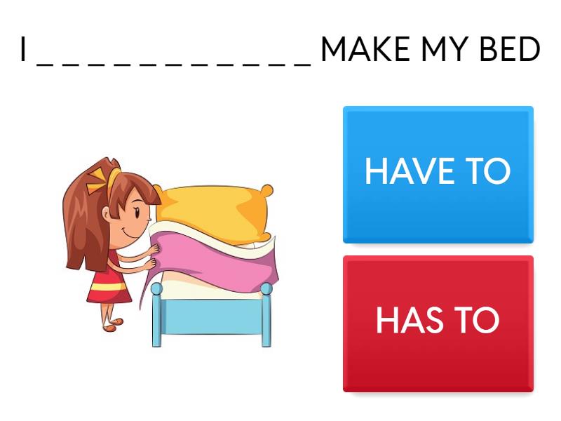 1) I _ _ _ _ _ _ _ _ _ _ _ MAKE MY BED a) HAVE TO b) HAS TO 2) SHE _ _ _ _ _ _ _ _ _ _ _ FEED THE PET a) HAVE TO b) HAS TO 3) HE _ _ _ _ _ _ _ _ _ _ _ DO THE DISHES a) HAVE TO b) HAS TO 4) MY DAD _ _ _ _ _ _ _ _ _ _ _ TAKE OUT THE RUBBISH a) HAVE TO b) HAS TO 5) MY MUM _ _ _ _ _ _ _ _ _ _ _ WALK THE DOG a) HAVE TO b) HAS TO 6) I _ _ _ _ _ _ _ _ _ _ _ STUDY FOR A TEST a) HAVE TO b) HAS TO 7) MY SISTER _ _ _ _ _ _ _ _ _ _ _ CLEAN MY ROOM a) DOESN'T HAVE TO b) DON'T HAVE TO 8) MY BROTHER _ _ _ _ _ _ _ _ _ _ _ PRACTISE FOOTBALL a) HAVE TO b) HAS TO 9) I _ _ _ _ _ _ _ _ _ _ _ LAY THE TABLE a) DON'T HAVE TO b) DOESN'T HAVE TO