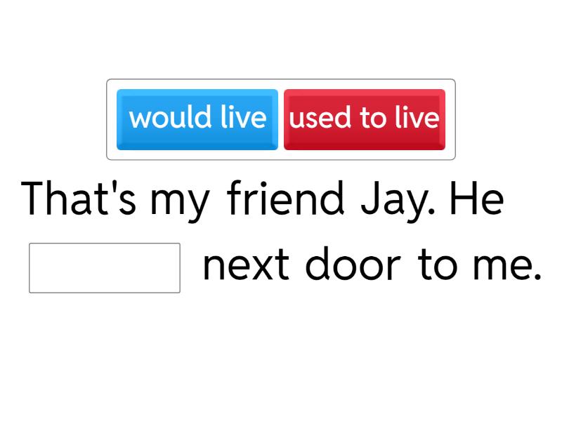 That's my friend Jay. He ____ next door to me. When I was a kid, I ____ play with my brother. Our neighbors ____ a pet rabbit. She ____ pizza. But now she loves it. My family used to go to the beach in the summer. We ____ go almost every weekend. My grandma used to keep candy in her pockets. She ____ always give us some. I ____ money twice when I was young.