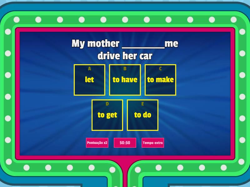 1) My mother _________me drive her car a) let b) to have c) to make d) to get e) to do 2) His teacher ______________him leave the classroom a) made b) making c) to make d) has make e) make 3) I __________ my hair cut yesterday a) to have b) had c) having d) has e) have 4) Although the doctor said it wasn’t necessary, I ___________him to check my last exams. a) gets b) got c) has gotten d) getting e) had gotten 5) Will your brother _________ you use his computer? a) let b) have c) has d) made e) had 6) I _________ my brother to help me with my homework a) gets b) get c) to get d) got e) gotten 7) Will your brother ________ you use his computer? a) have to b) has c) let d) make e) get 8) Who ________ you wear this old hat? a) made b) let c) has d) to have e) get 9) Please __________ your boss call me about our meeting. a) have b) having c) get d) make e) let 10) They _______ me to do homework. a) getting b) gets c) get d) make e) made