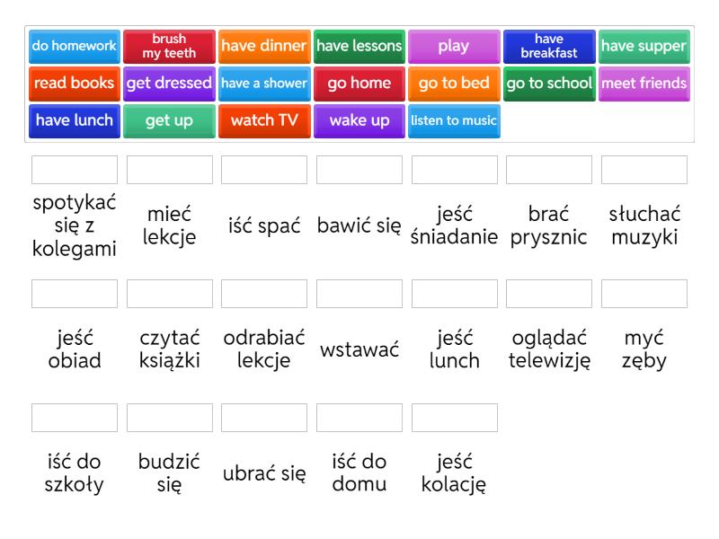get up - wstawać, have breakfast - jeść śniadanie, get dressed - ubrać się, go to school - iść do szkoły, have lessons - mieć lekcje, have lunch - jeść lunch, go home - iść do domu, do homework - odrabiać lekcje, watch TV - oglądać telewizję, read books - czytać książki, listen to music - słuchać muzyki, play - bawić się, have dinner - jeść obiad, have supper - jeść kolację, have a shower - brać prysznic, go to bed - iść spać, wake up - budzić się, brush my teeth - myć zęby, meet friends - spotykać się z kolegami,