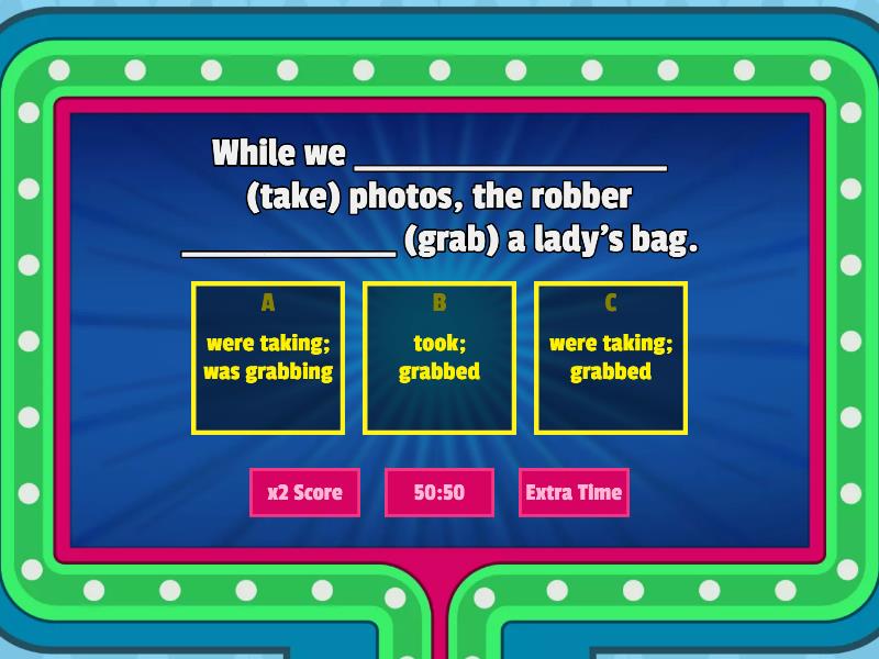 1) While we ___________________ (take) photos, the robber _____________ (grab) a lady's bag. a) were taking; was grabbing b) took; grabbed c) were taking; grabbed 2) While Mr Chan _______________________ (report) the incident, the police _______________________ (find) fingerprints. a) was reporting; found b) was reporting; were finding c) reported; found 3) We ______________________ (eat) ice cream while the police ____________________ (look) for evidence. a) ate; looked b) was eating; were looking c) were eating; looked d) were eating; were looking 4) The lady ______________________ (sleep) while the thief ______________________ (search) her bag. a) were sleeping; were searching b) was sleeping; searched c) was sleeping; was searching d) slept; searched 5) While the man __________________________ (wait) for the bus, a pickpocket _______________________________ (reach) into the man's pocket. a) were waiting; was waiting b) waited; was reaching c) was waiting; was reaching d) waited; reached 6) The shoplifter was putting a tin of hand cream into her bag ________________ a man was taking photos of her. a) while b) when 7) While the customer ________________(show) the photos to the security guard, the shoplifter ______________________ (leave) the shop. a) showed; was leaving b) was showing; was leaving c) was showing; was leaveing d) were showing; were leaving