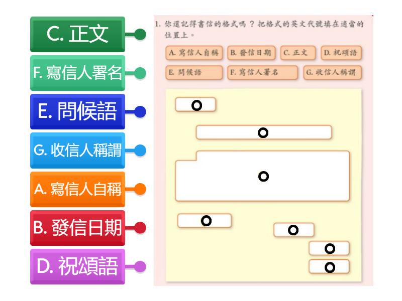 G. 收信人稱謂, B. 發信日期, A. 寫信人自稱, C. 正文, D. 祝頌語, E. 問候語, F. 寫信人署名.