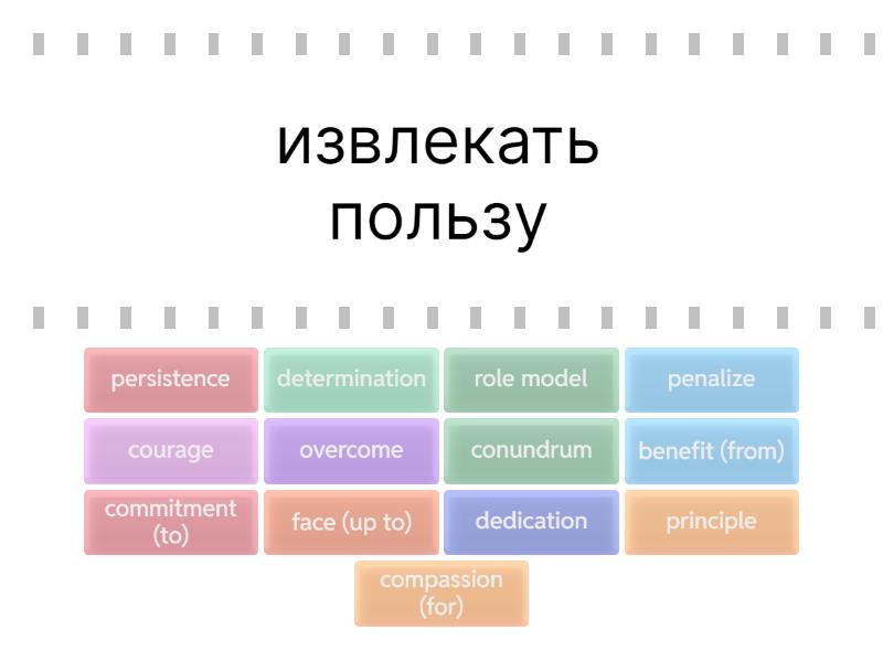 benefit (from) - извлекать пользу, commitment (to) - обязательство, compassion (for) - сострадание к, conundrum - головоломка, courage - смелость, dedication - преданность делу, determination - решимость, face (up to) - столкнуться с (проблемой), overcome - преодолеть, penalize - наказывать, persistence - настойчивость, principle - принцип, role model - образец для подражания,