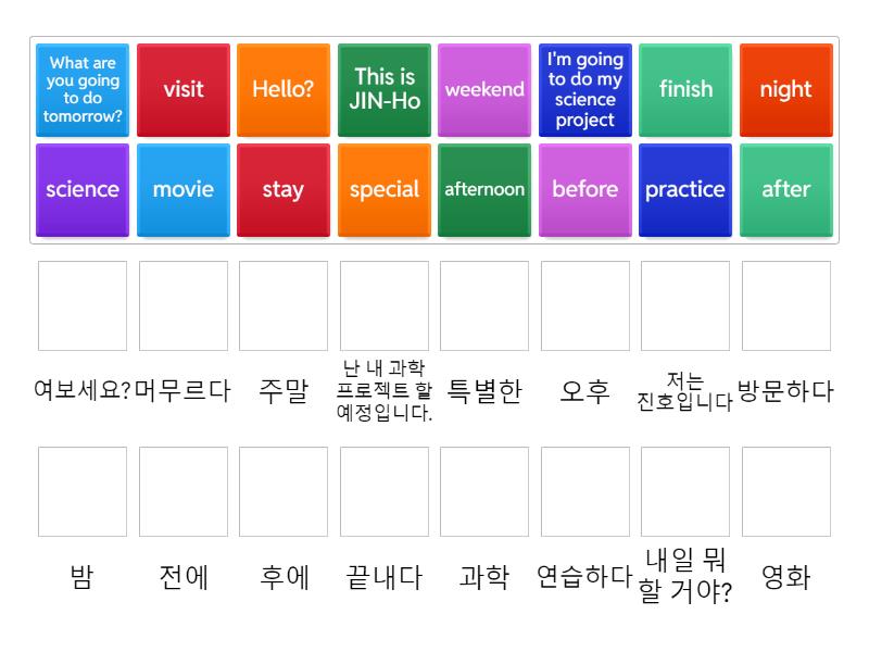before - 전에, after - 후에, afternoon - 오후, night - 밤, movie - 영화, finish - 끝내다, practice - 연습하다, stay - 머무르다, visit - 방문하다, science - 과학, weekend - 주말, special - 특별한, What are you going to do tomorrow? - 내일 뭐 할 거야?, I'm going to do my science project - 난 내 과학 프로젝트 할 예정입니다., Hello? - 여보세요?, This is JIN-Ho - 저는 진호입니다,