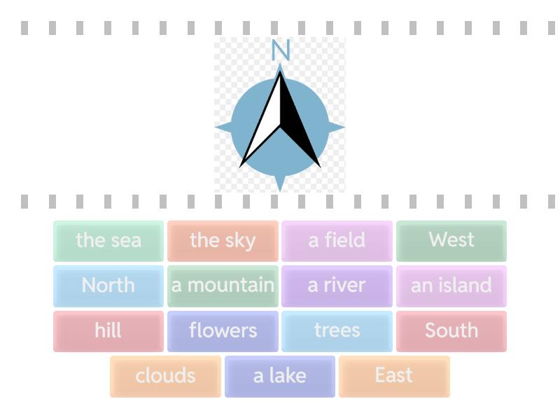 North, South, East, West, an island, a lake, the sea, the sky, a river, trees, hill, clouds, a mountain, a field, flowers,