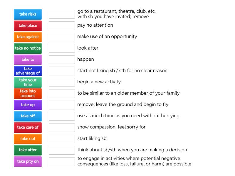 take care of - look after, take advantage of - make use of an opportunity, take place - happen, take into account - think about sb/sth when you are making a decision, take up - begin a new activity, take your time - use as much time as you need without hurrying, take no notice - pay no attention, take pity on - show compassion, feel sorry for, take to - start liking sb, take against - start not liking sb / sth for no clear reason, take off - remove; leave the ground and begin to fly, take out - go to a restaurant, theatre, club, etc. with sb you have invited; remove, take risks - to engage in activities where potential negative consequences (like loss, failure, or harm) are possible, take after - to be similar to an older member of your family,
