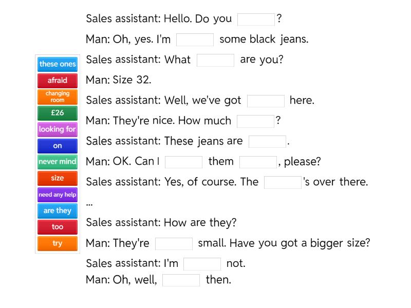 Sales assistant: Hello. Do you ____? Man: Oh, yes. I'm ____ some black jeans. Sales assistant: What ____ are you? Man: Size 32. Sales assistant: Well, we've got ____ here. Man: They're nice. How much ____? Sales assistant: These jeans are ____. Man: OK. Can I ____ them ____, please? Sales assistant: Yes, of course. The ____'s over there. ... Sales assistant: How are they? Man: They're ____ small. Have you got a bigger size? Sales assistant: I'm ____ not. Man: Oh, well, ____ then. Sales assistant: Hello, ____ you? Woman: Yes, please. Does this scarf ____ a different colour? Sales assistant: Yes, it does. We have it in blue, green or pink. Woman: ____ I see the pink one, please? Sales assistant: Here you are. Woman: Thank you. It's ____. How much does it ____? Sales assistant: Well, it's ____ this week. So it's only £12. Woman: Great. I'll take it.