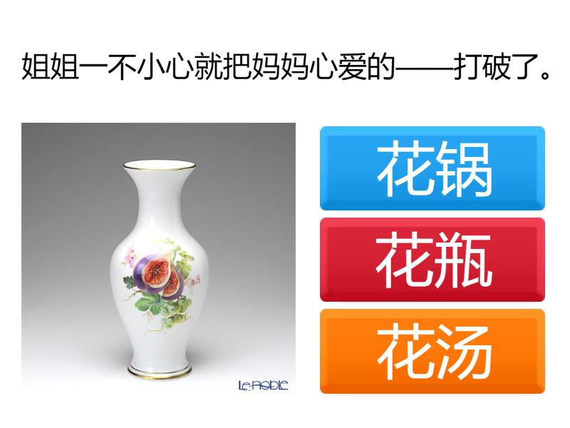 1) 姐姐一不小心就把妈妈心爱的——打破了。 a) 花锅 b) 花瓶 c) 花汤 2) 每当放学后,弟弟都会弹——。 a) 吉他 b) 小提琴 c) 钢琴 3) 妹妹养了一只可爱的——。 a) 小狗 b) 熊猫 c) 小熊 d) 泰迪熊 e) 小猫 4) 外婆家种了一棵———。 a) 芒果树 b) 橡胶树 c) 香蕉树 d) 草莓树 e) 榴莲树 5) 每个周末,妈妈都会带我到———买菜。 a) 购物中心 b) 商店 c) 菜市场 d) 公园 e) 动物园 6) 每逢春节,我们一家人都会回爷爷家。爷爷总会说:“吃了——年年高”。 a) 年饼 b) 冰激凌 c) 年糕 d) 汽水 e) 饮料 7) 琪琪最喜欢妈妈送给她的———。 a) 芭比娃娃 b) 泰迪熊 c) 小提琴 d) 吉他 e) 年糕 8) 上图代表什么词语? a) 哈哈大笑 b) 叽叽喳喳 c) 蹦蹦跳跳 d) 嘻嘻哈哈 e) 说说笑笑 9) 妹妹的书房里有一个——。 a) 笔筒 b) 书桌 c) 椅子 d) 铅笔 e) 颜色笔 10) 每当我有不会的汉字时,我都会———。 a) 喝饮料 b) 做功课 c) 查字典 d) 弹吉他 e) 驾汽车