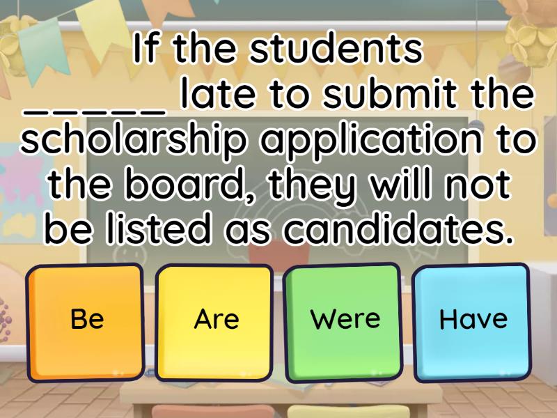 1) If the students _____ late to submit the scholarship application to the board, they will not be listed as candidates. a) Be b) Are c) Were d) Have 2) If your brother ______ here, he ______ us with this works. a) is – would help b) was – will help c) were – will help d) were – would help 3) You _____ the job if you were not late to the interview. a) would get b) would be gotten c) would have gotten d) would have been gotten 4) We would get the tickets, ______ a) Weren’t there so much rush at the cinema b) Because there were so much rush at the cinema c) There were not so much rush at the cinema d) Although there were so much rush at the cinema 5) If you ___ the exam, you would have been happy. a) pass b) passed c) had passed d) would pass 6) If it ___ sunny yesterday, we would have gone to the beach. a) is b) was c) were d) had been 7) If Dika ___ about the problem, he would have helped. a) know b) knew c) had known d) would have known 8) If I ___ rich, I would travel the world. a) am b) was c) were d) have been 9) If you ___ me, what would you do? a) are b) were c) be d) had been 10) I wouldn’t tell her if I ……….. you. She can’t keep a secret. a) will be b) am c) were d) had been