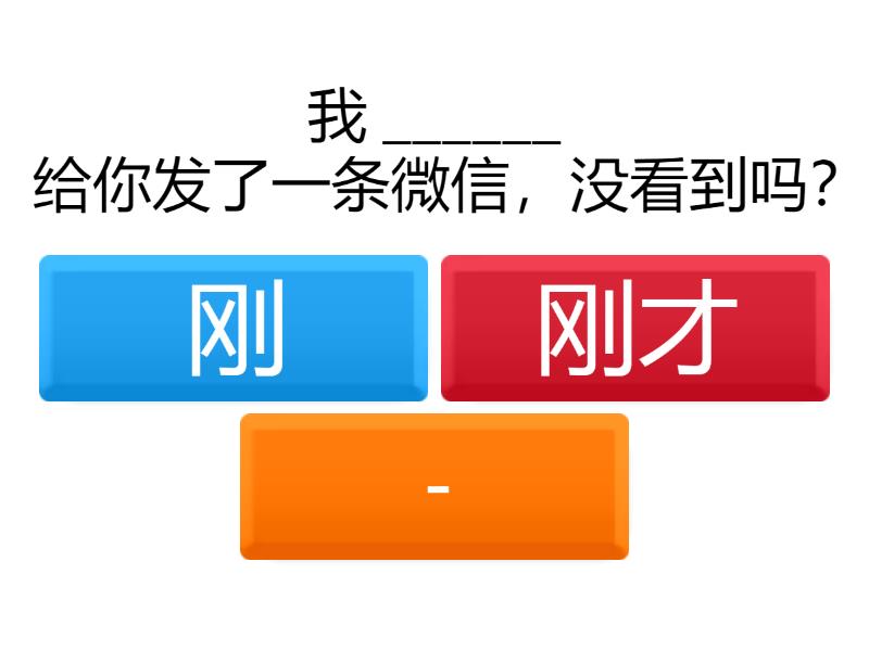 1) 我 ______ 给你发了一条微信,没看到吗? a) 刚 b) 刚才 c) - 2) 他 ______ 回家,你就让我洗餐具。 a) 刚 b) 刚才 3) 你 ______ 说什么?我没听清楚。 a) 刚 b) 刚才 4) 她 ______ 没吃完饭,就去健身房了。 a) 刚 b) 刚才 5) 我 ______ 去洗手间了,你找我了吗? a) 刚 b) 刚才 6) 老板 ______ 表扬了你,说你工作做得很好。 a) 刚 b) 刚才 7) 他 ______ 回答了老师的问题,回答得很聪明。 a) 刚 b) 刚才 8) 你 ______ 买的面包还热着呢! a) 刚 b) 刚才 c) - 9) 你_____做什么? a) 刚 b) 刚才 10) ______ 我看到他进教室了,你没看见吗? a) 刚 b) 刚才 11) 他 ______ 学了几句中文,就开始跟别人聊天了。 a) 刚 b) 刚才 12) 她 ______ 哭,现在好像好多了。 a) 刚 b) 刚才 13) 你 ______ 为什么那么生气?发生什么事了? a) 刚 b) 刚才 14) 我 ______ 到家,门就响了,是你来的吧? a) 刚 b) 刚才