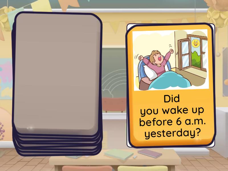 Did it rain last week?, Did you eat eggs for breakfast ? , Did you go to a restaurant yesterday? , Did they go to the beach last summer?, Did we celebrate Christmas last month?, Did the dog like the new toys?, Did you watch a movie yesterday?, Did you study English last weekend?, Did you wake up before 6 a.m. yesterday?.