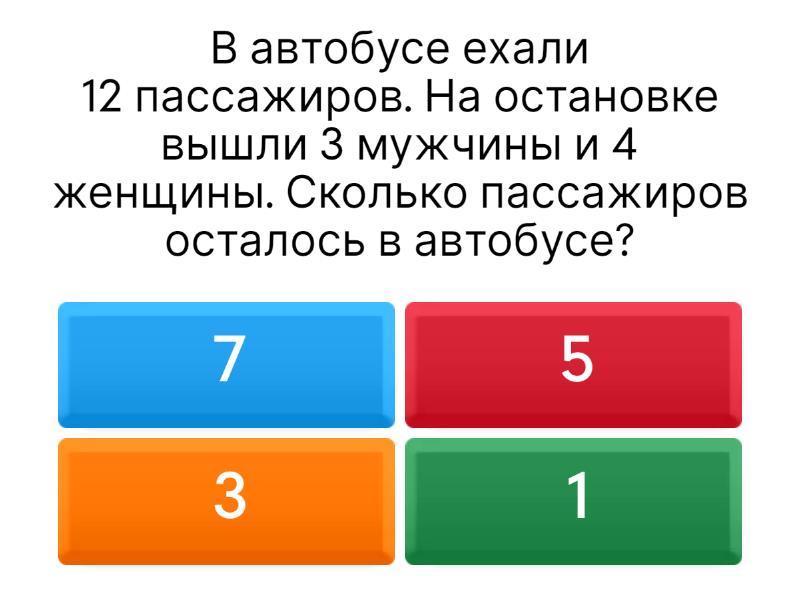 1) В автобусе ехали 12 пассажиров. На остановке вышли 3 мужчины и 4 женщины. Сколько пассажиров осталось в автобусе? a) 7 b) 5 c) 3 d) 1 2) В классе 13 комнатных растений. Дежурный полил 7 растений. Сколько цветков осталось полить? a) 5 b) 3 c) 6 d) 7 3) Шоколадка дороже мороженого, мороженое дороже пирожного. Сколько стоит Шоколадка? a) 60 рублей b) 70 рублей c) 40 рублей 4) У Маши вчера был день рождения. Завтра будет пятница. В какой день недели был день рождения Маши?   a) Вторник b) Среду c) Пятницу 5) Миша выше Толи, Толя выше Ромы. Кто самый высокий? a) Миша b) Толя c) Рома 6) Роман покрасил стороны кубика разными красками. Сколько красок для этого потребовалось? a) 6 b) 5 c) 4