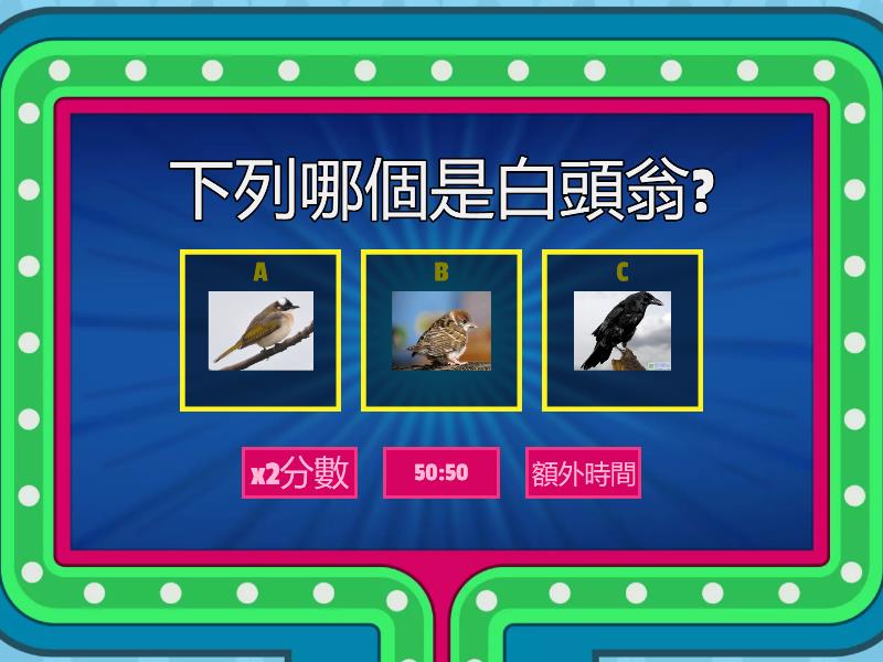 1) 下列哪個是白頭翁? a) b) c) 2) 根據課文,白頭翁有哪一個身分? a) b) c) 3) 根據課文,白頭翁的鳥巢藏在哪裡? a) b) c) 4) 作者在什麼時候觀察白頭翁? a) b) c) 5) 作者用什麼方法查詢白頭翁的資料? a) b) c) 6) 根據作者描述,白頭翁有穿哪個服飾? a) b) c) 7) 白頭翁求偶的季節是什麼時候? a) b) c) 8) 白頭翁在求偶時,有哪種行為? a) b) c)