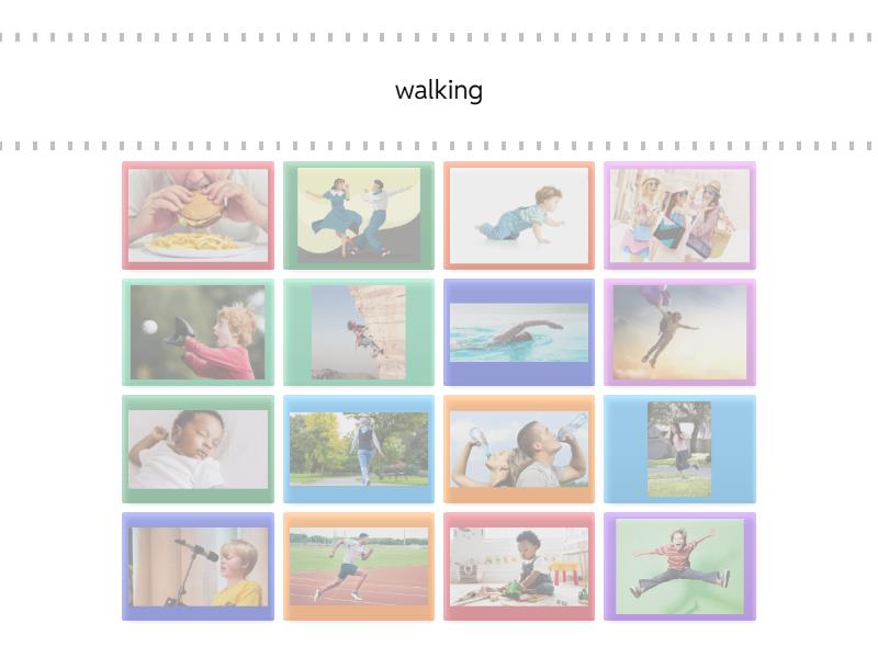walking, playing, running, dancing, shopping, singing, climbing, crawling, jumping, hopping, eating, drinking, sleeping, flying, swimming, catching a ball,