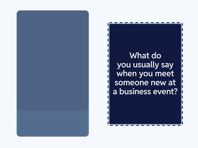 What would you say to a coworker who isn’t doing their job correctly?, What things do you consider to evaluate colleagues' work?, What did you do last weekend? Anything unusual?, Tell me an interesting or funny story that happened to you recently., Where did you live when you were a child? What was your life like back then?, What moments have been key in your life so far?, What do you usually do when you have guests at home?, What do you usually do when you visit a friend?, Do you have any plans for the next vacation? Where do you want to go?, How were your last holidays? What did you enjoy the most?, Have you visited any national parks or nature reserves in your country? What did you see there?, What animals do you want to see in their natural habitat?, If you had to choose a movie to watch with your friends this weekend, which one would you choose and why?, What kind of clothes do you prefer to wear on weekends?, Is there any piece of clothing you do not wear? Why?, What phrases do you usually use to start a conversation at work?, How do you participate in a meeting when it’s about a topic you already know?, Have you ever had an accident? What did you do ?, What do you say if you need to buy prescription medicine in a pharmacy?, How would you welcome a guest at a work event?, What do you usually say when you meet someone new at a business event?, Can you explain a simple proposal to improve your work area?, What elements will you include in a basic business proposal?, Can you explain the rules of your favorite game?, What instructions would you give to someone who wants to learn how to play your favorite game?.