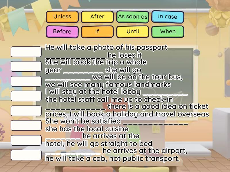 As soon as - _______ he arrives at the hotel, he will go straight to bed, When - _________ we will be on the tour bus, we will see many famous landmarks, Before - She will book the trip a whole year ________ she will go, In case - He will take a photo of his passport ____________ he loses it, Until - I will stay at the hotel lobby _________ the hotel staff call me up to check-in, After - ___________ he arrives at the airport, he will take a cab, not public transport., Unless - She won't be satisfied _____________ she has the local cuisine, If - ____________ there is a good idea on ticket prices, I will book a holiday and travel overseas,