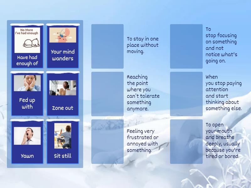 Fed up with - Feeling very frustrated or annoyed with something., Yawn - To open your mouth and breathe deeply, usually because you're tired or bored., Your mind wanders - When you stop paying attention and start thinking about something else., Sit still - To stay in one place without moving., Zone out - To stop focusing on something and not notice what's going on., Have had enough of - Reaching the point where you can’t tolerate something anymore.,