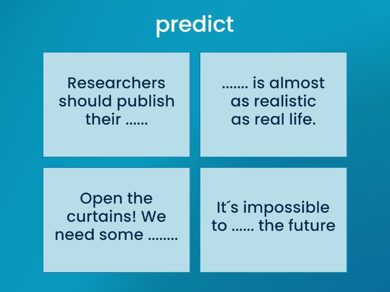 1) predict a) Researchers should publish their ...... b) ....... is almost as realistic as real life. c) Open the curtains! We need some ........ d) It´s impossible to ...... the future 2) findings a) The .......... is very wild and dramatic. b) Researchers should publish their ...... c) After midnight the town is ...... d) Open the curtains! We need some ........ 3) virtual reality a) It´s impossible to ...... the future b) You should go up into the mountains because the ....... is amazing. c) ....... is almost as realistic as real life. d) Researchers should publish their ...... 4) scenery a) It´s impossible to ...... the future b) Researchers should publish their ...... c) You should go up into the mountains because the ....... is amazing. d) Open the curtains! We need some ........ 5) deserted a) It´s impossible to ...... the future b) ....... is almost as realistic as real life. c) Researchers should publish their ...... d) After midnight the town is ...... 6) coastline a) The .......... is very wild and dramatic. b) It´s impossible to ...... the future c) Open the curtains! We need some ........ d) Researchers should publish their ...... 7) sunlight a) ....... is almost as realistic as real life. b) After midnight the town is ...... c) Open the curtains! We need some ........ d) Researchers should publish their ......