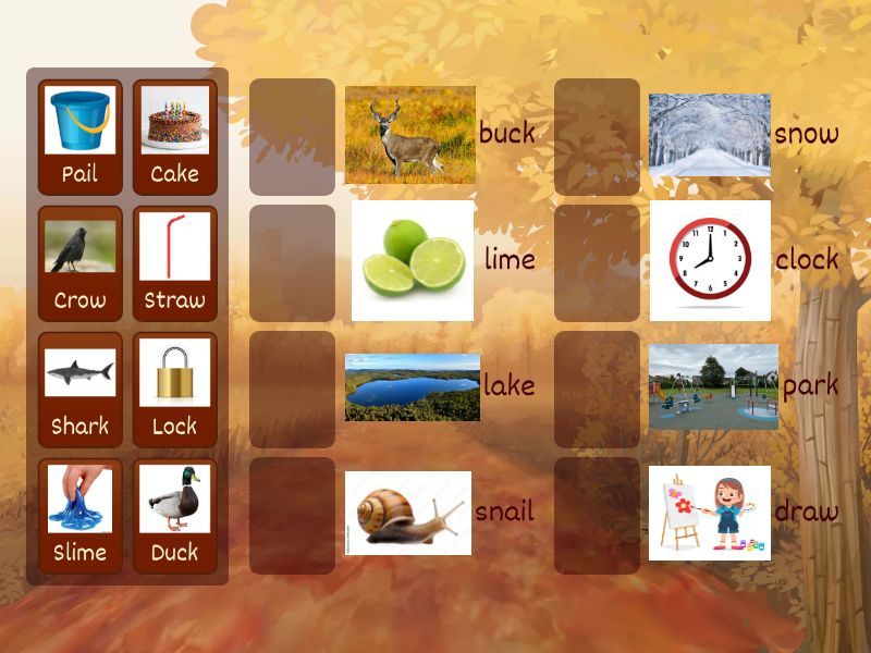 Lock - clock, Duck - buck, Straw - draw, Crow - snow, Slime - lime, Shark - park, Cake - lake, Pail - snail,