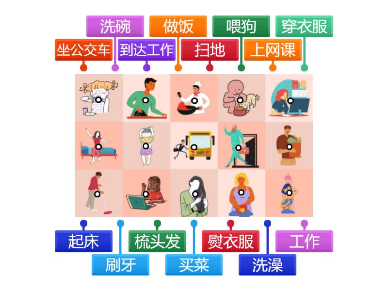 刷牙, 熨衣服, 做饭, 喂狗, 工作, 起床, 穿衣服, 坐公交车, 到达工作, 买菜, 扫地, 上网课, 梳头发, 洗碗, 洗澡.
