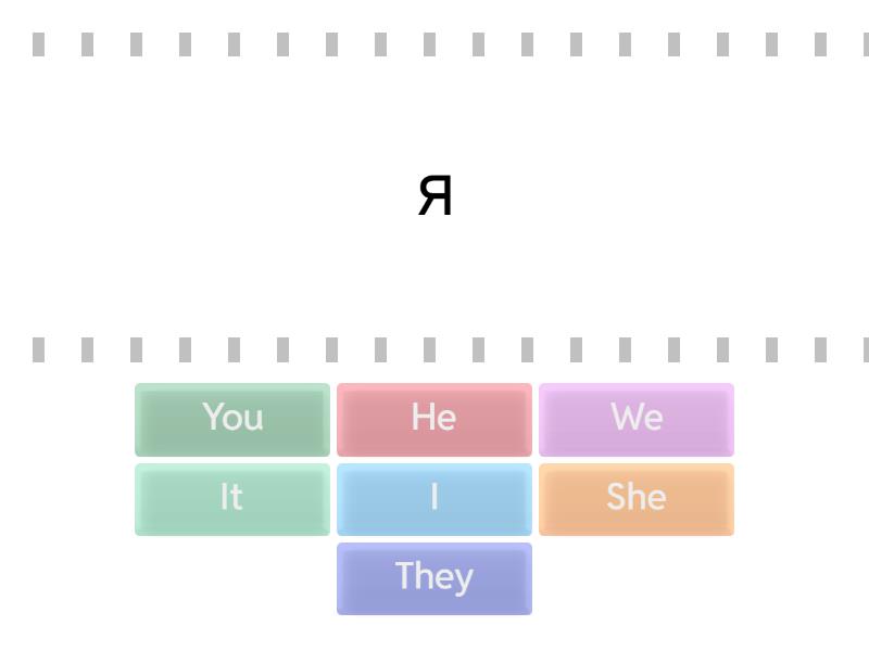 I - я, He - он, She - она, You - ты, вы, We - мы, They - они, It - оно,