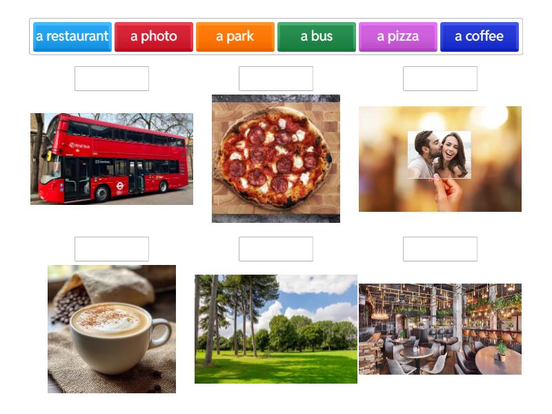 a restaurant, a photo, a pizza, a park , a coffee , a bus,