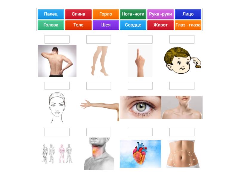 Голова, Лицо, Глаз - глаза, Рука -руки, Нога -ноги, Тело, Сердце, Палец, Живот, Шея, Спина, Горло,