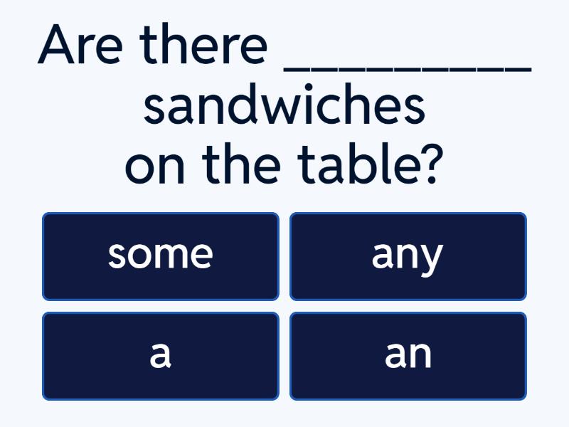1) Are there _________ sandwiches on the table? a) some b) any c) a d) an 2) Have you got ________ apple in your bag? a) a b) any c) an d) some 3) There is _________ honey in my tea. a) a b) some c) any d) an 4) There is _________ cabbage in the fridge. a) some b) any c) a d) an 5) There isn't _________ coffee in the cup. a) a b) any c) some d) an 6) We don't need ____________ bananas. a) any b) a c) some d) an 7) I want _________ meat and ______ onion. a) a / some b) a / an c) some / an d) some / any 8) My mum never drinks ___________ tea for breakfast. a) a b) any c) some d) an 9) Robert needs ______ milk. a) some b) a c) any d) an 10) We need __________ flour for the cake. a) a b) any c) some d) an 11) Would you like __________ hot dog? a) a b) some c) any d) an 12) Have you got __________ egg? a) any b) some c) an d) a 13) Can we buy _________ cheese here? a) a b) some c) any d) an 14) Do you want ________ cheeseburger? a) a b) any c) some d) an 15) Buy ______________ sweets, please! a) some b) a c) an d) any 16) They never invite __________________ friends. a) some b) a c) any d) an 17) We need _________ potato. a) an b) some c) any d) a