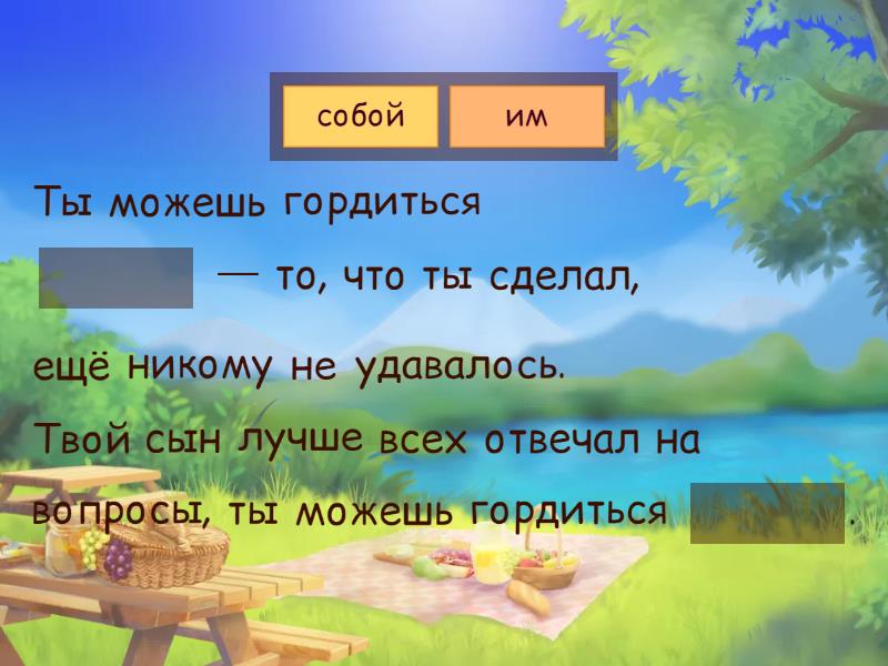 Ты можешь гордиться ____ — то, что ты сделал, ещё никому не удавалось. Твой сын лучше всех отвечал на вопросы, ты можешь гордиться ____. Она без ума от этого актера, ей нравится видеть ____ на экране. Она слишком любит находиться в центре внимания, для неё увидеть ____ на обложке журнала — цель жизни. Мне надо зайти ____ и переодеться. Я забыл у родителей зонтик, мне надо зайти ____ вечером. В этом деле мне никто не поможет, я могу рассчитывать только ____. Мой друг всегда рядом, я знаю, что могу ____ рассчитывать. Я всегда была ____ высокого мнения, и на этот раз она меня не подвела. Мне кажется, она переоценивает свои способности, она всегда была слишком высокого мнения ____. Посмотри ____ — почему я всё успеваю? Посмотри ____ — ты опять не готов к занятиям. Это его брат, во всяком случае, он так нам ____ представил. Так как меня здесь никто не знает, думаю, мне надо представить ____. Я позволю ____ сделать одно замечание. Не знаю, почему он взял твою книгу, я не позволял ____ делать этого.