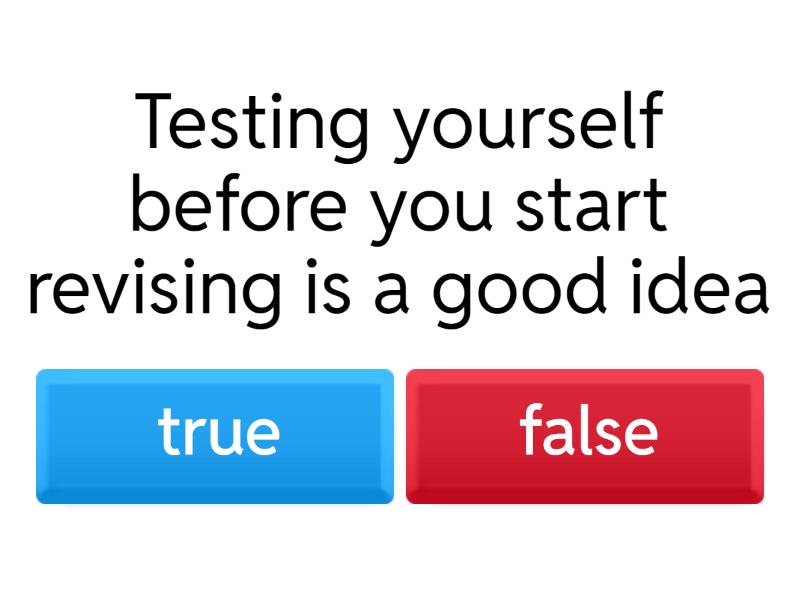 1) Testing yourself before you start revising is a good idea a) true b) false 2) Doing practice questions is the best way to revise a) Ture b) False 3) Ebbingman said to revise and revisit the material the next day a) True b) False 4) I should take breaks every hour for one hour a) True b) False 5) If I make flashcards, I will remember the content a) True b) False 6) I should revisit my learning the next day, a few days later, a week later then a month later a) True b) False 7) I need to look at my subject text books to help me revise a) True b) False 8) I need to start revision a few weeks before the exam, otherwise I forget the information a) True b) False
