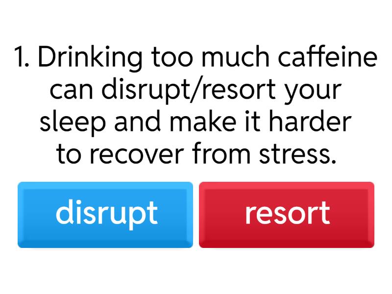 1) 1. Drinking too much caffeine can disrupt/resort your sleep and make it harder to recover from stress. a) disrupt b) resort 2) People with weaker immune systems are more susceptible /fluctuating to illness during long periods ofstress. a) susceptible b) fluctuating 3) She found herself weaken /craving sugary snacks every afternoon during exam week. a) weaken b) craving 4) Constantly eating junk food was only exacerbating / disrupting his stress, not relieving it. a) exacerbating b) disrupting 5) Many ready meals are highly susceptible / processed, meaning they contain additives and lack essential vitamins. a) susceptible b) processed 6) If you don’t rest properly,stresscan gradually crave /weaken your body and mind. a) crave b) weaken 7) When I’m stressed, I often exacerbate /resort to eating crisps or chocolate, even though I know they won’t help in the long run. a) exacerbate b) resort 8) Her energy level swere fluctuating / nutrients all day because she skipped breakfast and only ate snacks. a) fluctuating b) nutrients 9) Leafy greens, nuts, and whole grains are full of important nutrients/ fluctuating that support both physical and mental health. a) nutrients b) fluctuating 10) White bread and pastries are made with susceptible /refined flour, which providesless nutritional value than whole meal options. a) susceptible b) refined