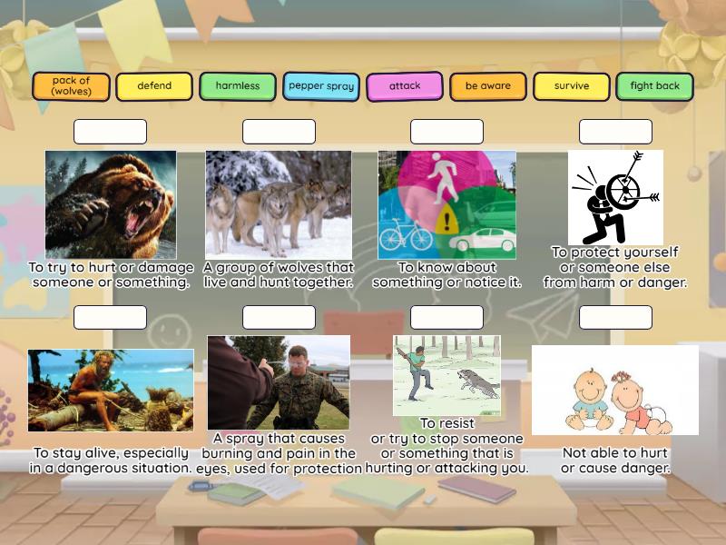 defend - To protect yourself or someone else from harm or danger., fight back - To resist or try to stop someone or something that is hurting or attacking you., pack of (wolves) - A group of wolves that live and hunt together., pepper spray - A spray that causes burning and pain in the eyes, used for protection, harmless - Not able to hurt or cause danger., survive - To stay alive, especially in a dangerous situation., be aware - To know about something or notice it., attack - To try to hurt or damage someone or something.,