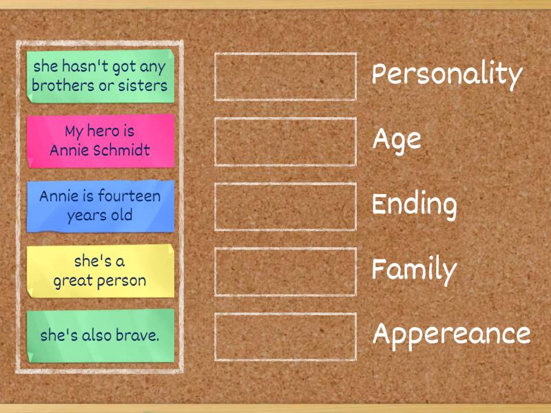 she's a great person - Ending, she hasn't got any brothers or sisters - Family, she's also brave. - Personality, My hero is Annie Schmidt - Appereance, Annie is fourteen years old - Age,