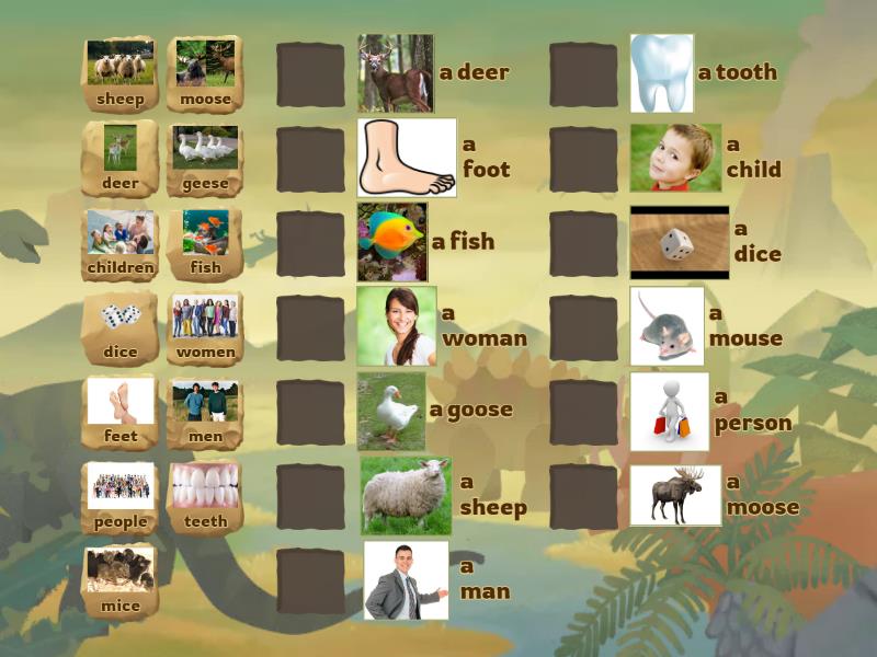 children - a child, people - a person, feet - a foot, men - a man, women - a woman, mice - a mouse, fish - a fish, deer - a deer, sheep - a sheep, teeth - a tooth, moose - a moose, dice - a dice, geese - a goose,