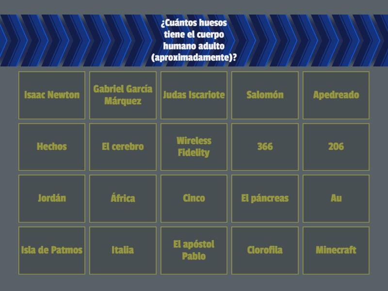 206 - ¿Cuántos huesos tiene el cuerpo humano adulto (aproximadamente)?, Clorofila - ¿Qué sustancia hace que las plantas sean verdes?, Au - ¿Cuál es el símbolo químico del oro?, 366 - ¿Cuántos días tiene un año bisiesto?, Wireless Fidelity - ¿Qué significa "Wi-Fi"?, África - ¿Qué continente tiene más países?, El páncreas - ¿Qué parte del cuerpo produce la insulina?, Cinco - ¿Cuántas sílabas tiene la palabra “maravilloso”?, El cerebro - ¿Qué órgano del cuerpo humano consume más energía?, Italia - ¿Qué país tiene forma de bota?, Minecraft - ¿Qué videojuego tiene personajes como Creeper y Enderman?, Isaac Newton - ¿Qué científico formuló las leyes del movimiento?, El apóstol Pablo - ¿Quién escribió la mayoría de las cartas del Nuevo Testamento?, Hechos - ¿Qué libro viene después de los Evangelios?, Salomón - ¿Qué rey pidió sabiduría en lugar de riquezas?, Jordán - ¿Cómo se llama el río donde Juan Bautista bautizó a Jesús?, Apedreado - ¿Cómo murió Esteban, el primer mártir cristiano?, Judas Iscariote - ¿Quién traicionó a Jesús por 30 monedas de plata?, Isla de Patmos - ¿En qué isla estuvo exiliado el apóstol Juan cuando escribió Apocalipsis?, Gabriel García Márquez - ¿Quién escribió "Cien años de soledad"?,