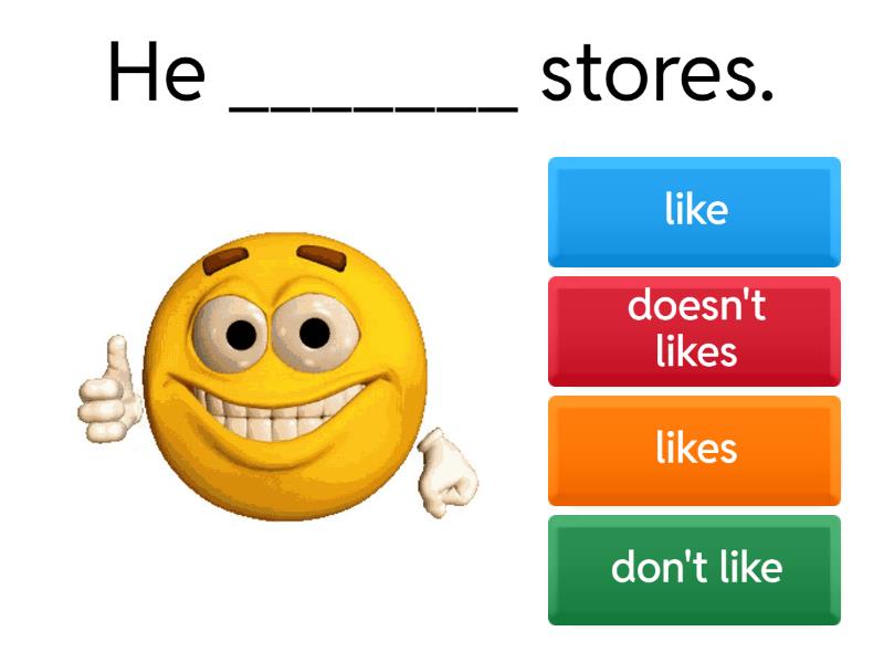 1) He _______ stores. a) like b) doesn't likes c) likes d) don't like 2) She _______ rivers. a) don't like b) doesn't like c) likes d) like 3) Jackie _____________. a) like library b) doesn't like library c) likes libraries 4) Sam ____________. a) likes schools b) doesn't like school c) don't like schools 5) Sally ____________. a) like swimming pools b) don't like swimming pools c) doesn't like swimming pools 6) They _____________. a) likes parks b) doesn't like parks c) like parks d) like park 7) Tim _____________. a) likes playground. b) doesn't like playgrounds. c) don't like playgrounds. 8) Mom and Dad _____________. a) like museums b) don't like museum c) doesn't like museums d) likes museums 9) I _______________. a) like farm b) don't like farms c) doesn't like farms 10) We _________. a) like stores b) doesn't like stores c) don't like store 11) Mom and I _____________. a) like castle b) likes castles c) don't like castles d) doesn't like castles 12) It __________. a) likes rivers b) don't like rivers c) doesn't like river d) like rivers 13) Kelly ___________. a) like cafés b) likes cafés c) doesn't like café 14) The mouse ____________. a) doesn't like kitchen b) like kitchen c) likes kitchens 15) The dogs ______________. a) doesn't like parks b) like parks c) likes parks