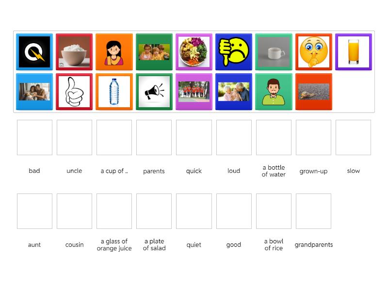 quiet, loud, quick, slow, bad, good, uncle, aunt, cousin, grown-up, parents, grandparents, a bowl of rice, a cup of .., a plate of salad, a bottle of water, a glass of orange juice,