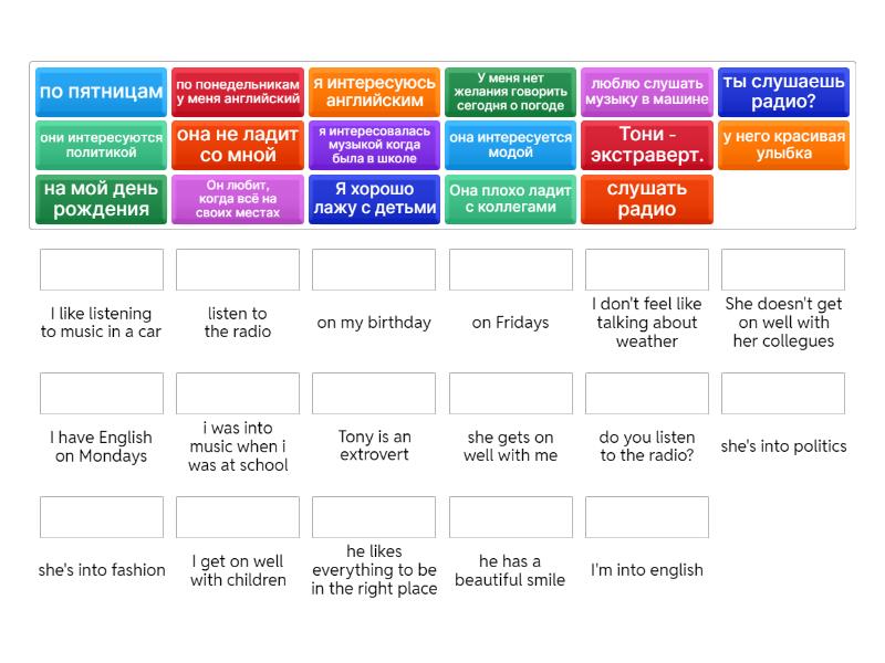 Тони - экстраверт. - Tony is an extrovert, У меня нет желания говорить сегодня о погоде - I don't feel like talking about weather , Я хорошо лажу с детьми - I get on well with children, Она плохо ладит с коллегами - She doesn't get on well with her collegues, у него красивая улыбка - he has a beautiful smile, я интересуюсь английским - I'm into english, она интересуется модой - she's into fashion, они интересуются политикой - she's into politics, я интересовалась музыкой когда была в школе - i was into music when i was at school, Он любит, когда всё на своих местах - he likes everything to be in the right place, по пятницам - on Fridays, на мой день рождения - on my birthday, по понедельникам у меня английский - I have English on Mondays, слушать радио - listen to the radio, люблю слушать музыку в машине - I like listening to music in a car, ты слушаешь радио? - do you listen to the radio?, она не ладит со мной - she gets on well with me,
