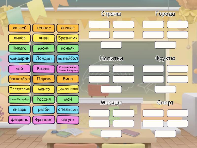 Страны: Россия, Бразилия, Португалия, Франция, Соединенные Штаты Америки, Города: Чикаго, Лондон, Париж, Казань, Санкт-Петербург, Напитки: Вино, ликёр, шампанское, коньяк, чай, Фрукты: киви, мандарин, апельсин, ананас, манго, Месяцы: январь, февраль, май, июнь, август, Спорт: хоккей, регби, волейбол, баскетбол, теннис,