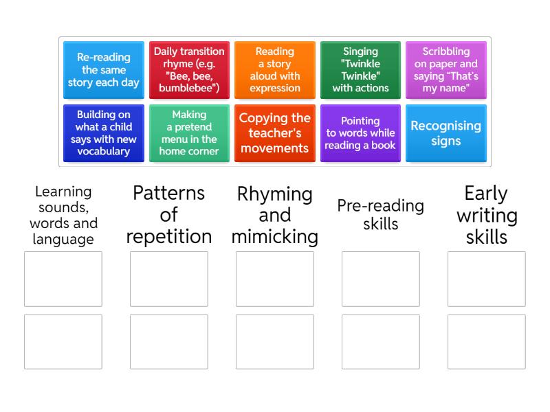 Learning sounds, words and language: Reading a story aloud with expression, Building on what a child says with new vocabulary, Patterns of repetition: Daily transition rhyme (e.g. "Bee, bee, bumblebee"), Re-reading the same story each day, Rhyming and mimicking: Singing "Twinkle Twinkle" with actions, Copying the teacher’s movements, Pre-reading skills: Pointing to words while reading a book, Recognising signs, Early writing skills: Scribbling on paper and saying “That’s my name”, Making a pretend menu in the home corner,