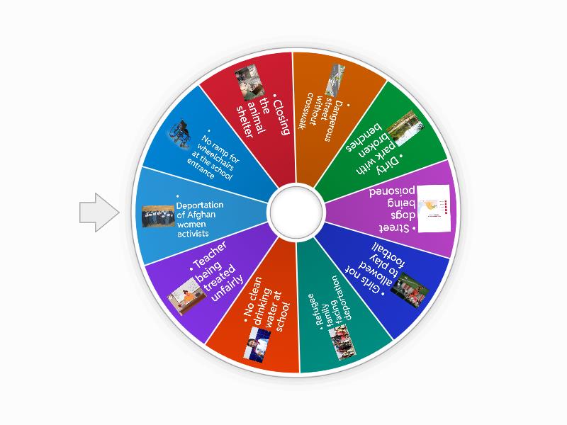 1) • No ramp for wheelchairs at the school entrance 2) • Closing the animal shelter 3) • Dangerous street without crosswalk 4) • Dirty park with broken benches 5) • Street dogs being poisoned 6) • Girls not allowed to play football 7) • Refugee family facing deportation 8) • No clean drinking water at school 9) • Teacher being treated unfairly 10) • Deportation of Afghan women activists