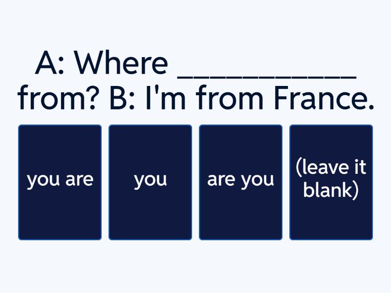 1) A: Where ___________ from? B: I'm from France. a) you are b) you c) are you d) (leave it blank) 2) We have ___________ house in Paris. a) any b) a c) an d) (leave it blank) 3) A: How old are you? B: I ___________ 38 years old. a) have b) 'm c) is 4) I have two ___________ , a boy and a girl. a) sons b) children c) daughters d) (leave it blank) 5) I work in a ___________. I'm a doctor. a) hospital b) hotel c) supermarket d) (leave it blank) 6) This is my brother. ___________ name's David. a) Her b) His c) He's d) (leave it blank) 7) My ___________ is Peter. a) name's father b) fathers name c) father's name d) (leave it blank) 8) ___________ five people in my family. a) Have b) They are c) There are d) (leave it blank) 9) I get up ___________ 8 o'clock in the morning. a) for b) at c) in d) (leave it blank) 10) I like apples, but I ___________ bananas. a) don't like b) like c) do like d) (leave it blank) 11) My friend ___________ to the gym everyday. a) gos b) go c) goes d) (leave it blank) 12) Excuse me, ___________ speak French? a) do you b) you do c) you d) (leave it blank) 13) How much are ___________ shoes? a) these b) this c) that d) (leave it blank) 14) I can cook, but I ___________ dance. a) can b) can't c) can't to d) (leave it blank) 15) We ___________ to the beach last weekend. We had a great time! a) did went b) did go c) went d) (leave it blank) 16) A: Where are my keys? B: They're ___________ your desk. a) in b) at c) on d) (leave it blank) 17) My sister ___________ tennis very well. a) playes b) plays c) play d) (leave it blank) 18) I usually go to work ___________ Uber. a) by b) with c) in d) (leave it blank) 19) I don't see my parents very often ___________ they live in Portugal. a) so b) but c) because d) (leave it blank) 20) Last night I ___________ meat. It was delicious! a) ate b) eaten c) rated d) (leave it blank) 21) The ___________ is quite expensive, but the food there is really tasty. a) hospital b) movie theater c) restaurant d) (leave it blank) 22) A: ___________ were you last weekend? B: I was in Rio. The weather was great! a) When b) Where c) How d) (leave it blank) 23) A: ___________ you have a good time on your trip to Spain? B: Yes, it was awesome. a) Were b) Had c) Did d) (leave it blank) 24) Are you ___________ lawyer? a) James b) James' c) James'es d) (leave it blank) 25) Robert will meet ___________ at the bar. a) us b) we c) our d) (leave it blank) 26) I'm going to a sushi restaurant tonight. ___________ you like to come? a) Could b) Would c) Do d) (leave it blank) 27) I like this apartment but the ___________ is too expensive for me. a) money b) cost c) rent d) (leave it blank) 28) Excuse me. How can I ___________ to the nearest gas station? a) come b) get c) arrive d) (leave it blank) 29) A: Do you sell phone cases here? B: Yes, we do. How ___________ would you like? a) much b) many c) any d) (leave it blank) 30) A: Sorry I'm so late. B: That's ___________. a) OK b) right c) great d) (leave it blank) 31) I'd like ___________ plant-based milk in my coffee, please. a) some b) any c) a d) (leave it blank) 32) ___________ an Itaú bike station near my apartment. a) Here's b) There's c) Have d) (leave it blank) 33) A: Is this a good time to FaceTime? B: Sorry, no. I ___________ dinner. a) 'm cooking b) cooking c) cook d) (leave it blank) 34) I think Apple smartphones are better ___________ Samsung ones. a) to b) then c) than d) (leave it blank) 35) We ___________ going to the beach next weekend. Wanna come? a) are b) will c) do d) (leave it blank) 36) ___________ meet for some coffee sometime soon. a) Let's b) Shall we c) Go d) (leave it blank) 37) If you've got a headache, you ___________ see a doctor. I might be Covid. a) can b) should c) could d) (leave it blank) 38) ___________ ever been to New York? a) Have you b) Did you c) Are you d) (leave it blank) 39) A: I only get about 5 hours' sleep a night. B: That's not ___________ . a) enough b) too much c) lot d) (leave it blank) 40) A: Did Paula finish the report? B: Now, she ___________ it tomorrow. a) finishes b) going to finish c) finished d) (leave it blank) 41) Carol ___________ loves posting on Instagram. a) much b) very c) really d) (leave it blank) 42) A: Is Canberra the capital of Australia? B: I ___________ . a) think yes b) think is c) think so d) (leave it blank) 43) We never ___________ a TV when I was a child. Nowadays I'm a millionaire! a) have b) had c) 'd had d) (leave it blank) 44) A: How would you like to pay? B: ___________ cash. a) By b) With c) On d) (leave it blank) 45) A: What time can you arrive at my party tonight? B: It depends ___________ the traffic. a) on b) of c) at d) (leave it blank)