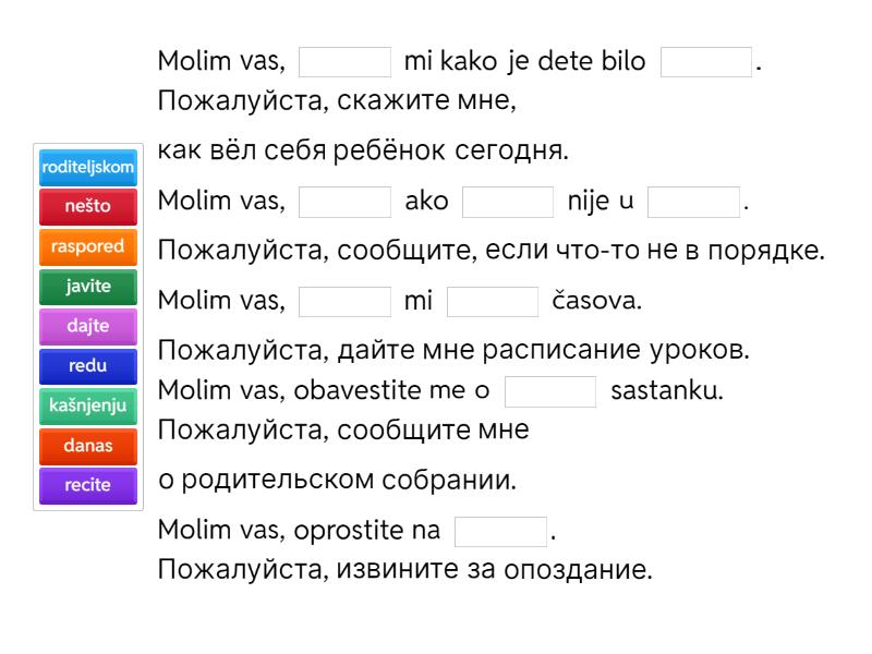 Molim vas, ____ mi kako je dete bilo ____. Пожалуйста, скажите мне, как вёл себя ребёнок сегодня. Molim vas, ____ ako ____ nije u ____. Пожалуйста, сообщите, если что-то не в порядке. Molim vas, ____ mi ____ časova. Пожалуйста, дайте мне расписание уроков. Molim vas, obavestite me o ____ sastanku. Пожалуйста, сообщите мне о родительском собрании. Molim vas, oprostite na ____. Пожалуйста, извините за опоздание. Molim vas, ____ da li je uradio ____. Пожалуйста, проверьте, сделал ли он домашнее задание. Molim vas, ____ đačku ____. Пожалуйста, посмотрите дневник. Molim vas, dajte ____ za ____. Пожалуйста, дайте задание на выходные. Molim vas, pošaljite ____. Пожалуйста, пришлите уведомление. Molim vas, recite mi ____ je ____ test. Пожалуйста, скажите мне, когда следующий тест. Molim vas, ____ na njegovo ____ Пожалуйста, обратите внимание на его поведение. Molim vas, ____ ocenu. Пожалуйста, объясните оценку. Molim vas, ____ nas ako treba nešto ____. Пожалуйста, направьте нас, если нужно что-то дополнительное. Molim vas, ____ kada možemo ____. Пожалуйста, скажите, когда мы можем прийти. Molim vas, ____ svesku iz ____. Пожалуйста, посмотрите тетрадь по сербскому.