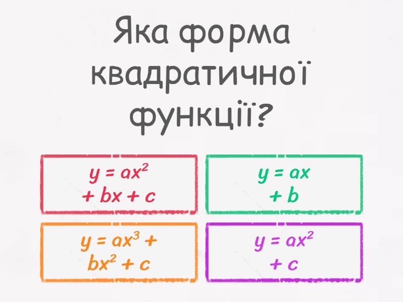 1) Яка форма квадратичної функції? a) y = ax2 + bx + c b) y = ax + b c) y = ax3 + bx2 + c d) y = ax2 + c 2) Як називається графік квадратичної функції? a) Пряма b) Парабола c) Гіпербола d) Еліпс 3) Що визначає коефіцієнт 'a' у функції? a) Вершину b) Напрямок гілок c) Перетин з віссю Y d) Фокус 4) Якщо a > 0, то гілки параболи... a) Вниз b) Вгору c) Вліво d) Вправо 5) Якщо a < 0, то гілки параболи... a) Вгору b) Вниз c) Вліво d) Вправо 6) Яка точка є вершиною параболи? a) (0,0) b) (-b/2a, f(-b/2a)) c) (a,b) d) (b,c) 7) Як знайти вісь симетрії параболи? a) x = -b/2a b) y = ax2 c) x = a d) y = b 8) Якщо дискримінант > 0, то... a) Два різних корені b) Один корінь c) Немає коренів d) Три корені 9) Якщо дискримінант = 0, то... a) Два різних корені b) Один корінь c) Немає коренів d) Три корені