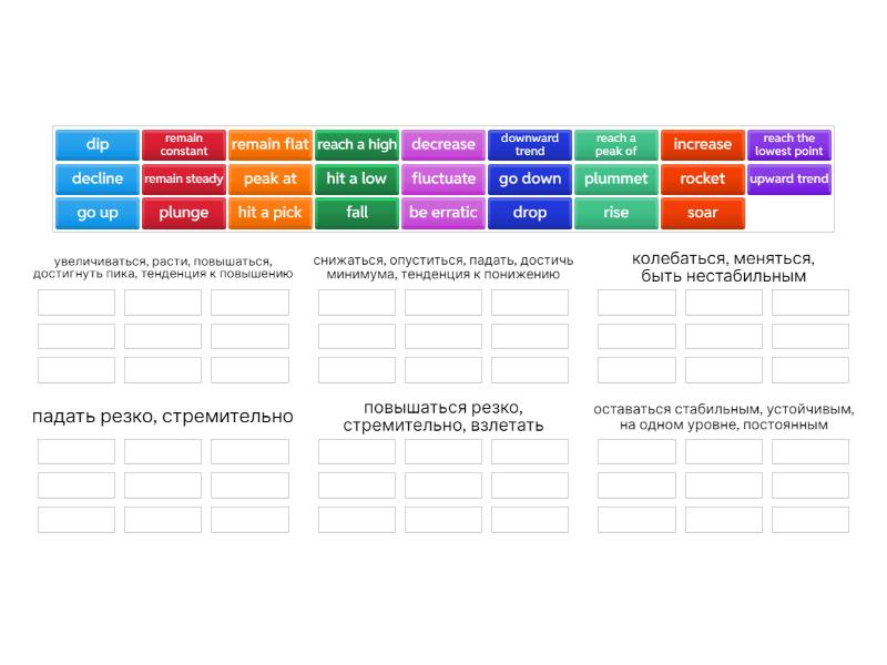увеличиваться, расти, повышаться, достигнуть пика, тенденция к повышению: go up, increase, peak at, reach a peak of, upward trend, hit a pick, reach a high, rise, снижаться, опуститься, падать, достичь минимума, тенденция к понижению: decline, drop, fall, hit a low, reach the lowest point, decrease, downward trend , go down, dip, колебаться, меняться, быть нестабильным: be erratic, fluctuate, падать резко, стремительно: plummet, plunge, повышаться резко, стремительно, взлетать: rocket, soar, оставаться стабильным, устойчивым, на одном уровне, постоянным : remain constant, remain steady, remain flat,